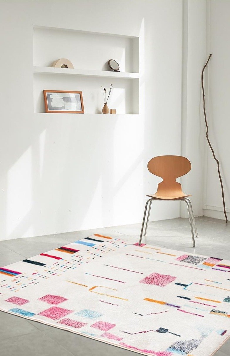 Etsitkö täydellistä mattoa, joka yhdistää perinteisen viehätyksen ja nykyaikaisen tyylin? Tämä upea valkoinen berberityylinen kelim-matto moderniin kotiin on suunniteltu juuri sinua varten. Se on enemmän kuin pelkkä lattianpäällyste; se on sisustuselementti, joka henkii kodikkuutta, mutta samalla tuo tilaan modernia, taiteellista otetta. Kuvittele, kuinka sen pehmeä, valkoinen pohja yhdessä leikkisän geometrisen kuvion ja kirkkaiden värien, kuten pinkin, sinisen, oranssin ja mustan, kanssa elävöittää olohuoneesi, makuuhuoneesi tai jopa työhuoneesi ilmettä. Se on ihanteellinen valinta sinulle, joka arvostat ainutlaatuista muotoilua ja haluat luoda kotiisi viihtyisän, mutta modernin tunnelman.