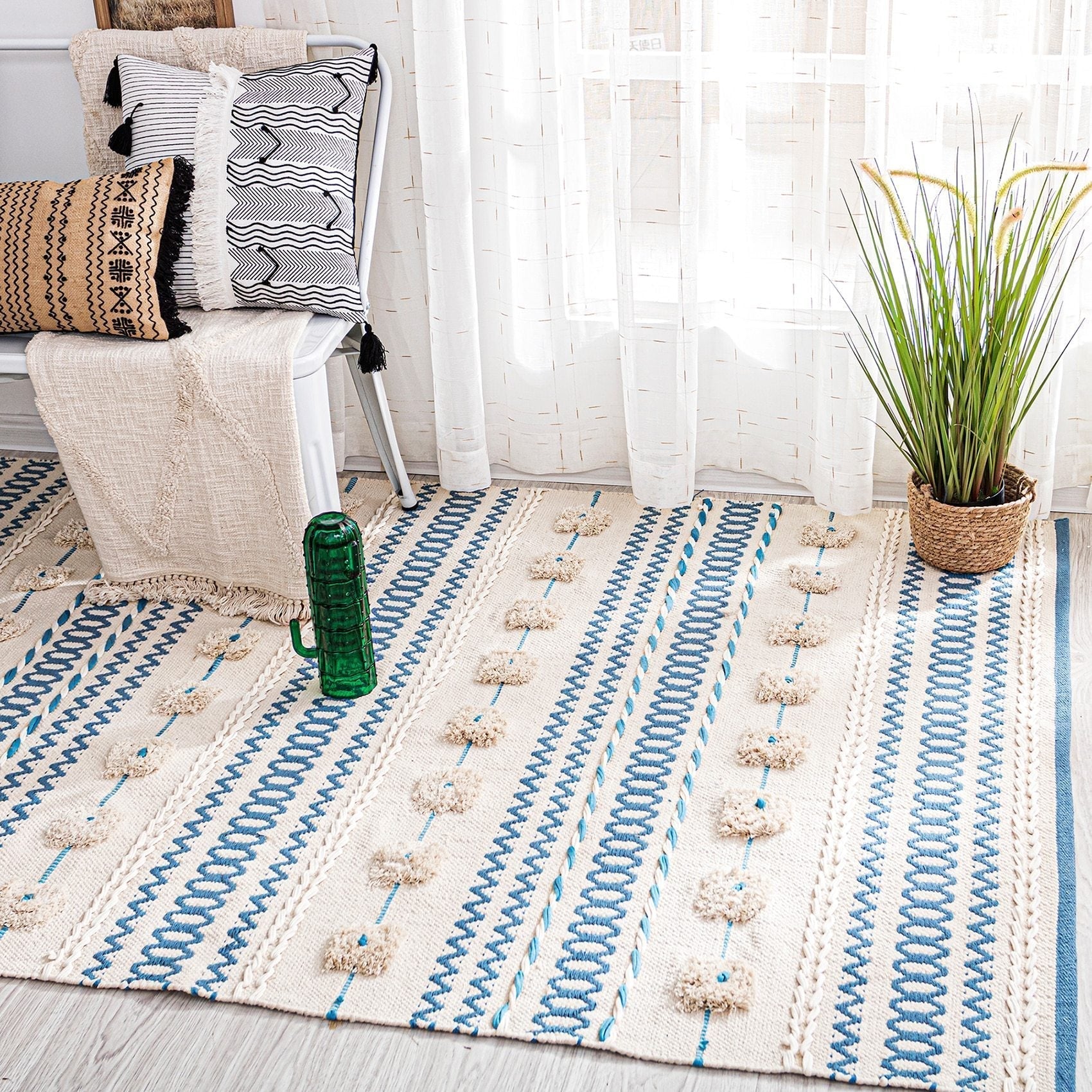 Miksi valita juuri tämä valkoinen ja sininen puuvillamatto tupsuilla?